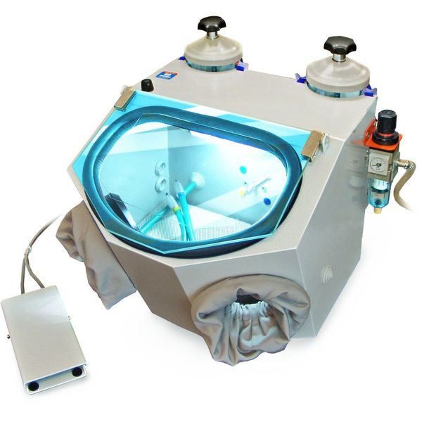 - Обработка протеза происходит под мощной струей абразива из МС 4.3 С (диаметр сопла – 1 мм). Отработанный песок через калиброванное сито попадает в накопительный бункер.