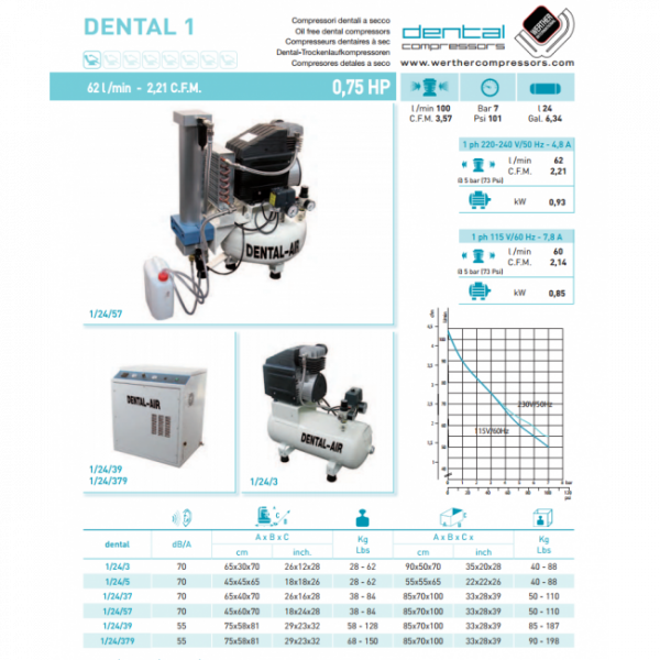 Проверенное решение для клиники на одну установку. Компрессор стоматологический Cattani на 1 уста.. Dental Air 1/24/39 – безмасляный воздушный компрессор на 1 установку, с кожухом, 100 л/мин | Werther Int. (Италия) Безмасляный стоматологический воздушный компрессор Dental-Air 1 предназначен для подачи сухого, чистого, профильтрованного воздуха в стоматологические установки с пневматическими наконечниками. Звукоизолирующий кожух с установленными на верхней приборной панели манометрами давления воздуха в ресивере и на выходе, регулятором давления, счетчиком фактически отработанного времени в часах, а также влагоотделителем. Кол-во обслуживаемых установок – 1 Технические характеристики: Производительность 100 л/мин Объём ресивера 24 л Уровень шума 55 Дб Электрическая мощность 0,6 кВт Максимальное давление в ресивере 7 бар Современные и надежные компрессоры Dental-Air мирового лидера в области производства высококачественных компрессоров для стоматологических клиник и кабинетов – компании Werther International – более 20 лет обеспечивают подачу чистого, сухого, фильтрованного воздуха в стоматологические установки как в Европе, так и в России. Инструкция к Dental Air 1/24/39 – безмасляный воздушный компрессор на 1 установку, с кожухом, 100 л/мин на русском языке Брошюра к Dental Air 1/24/39 – безмасляный воздушный компрессор на 1 установку, с кожухом, 100 л/мин на русском языке